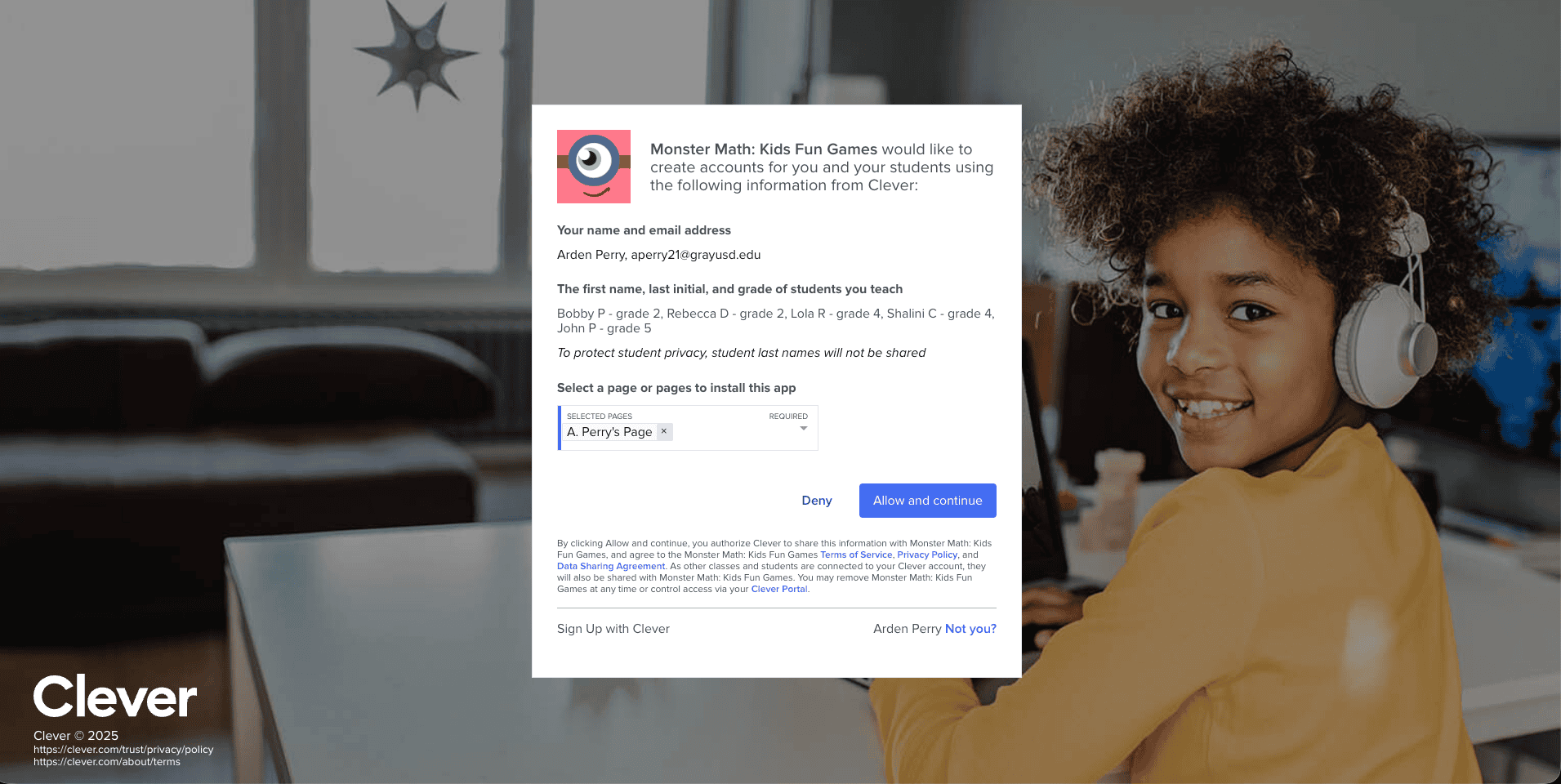 2. Once you have been successfully logged in, click on 'Allow and continue' to grant Monster Math permission to view your student details